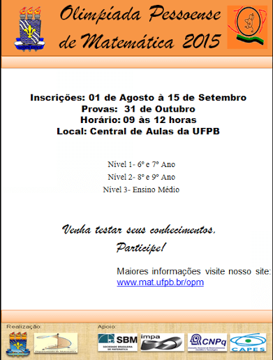 Este é o novo blog da Olimpíada Pessoense de Matemática. Estamos apenas começando os trabalhos, então fique de olho. Aqui você vai encontrar provas de anos anteriores, materiais de oficinas, fotos, listas de premiados e muito mais.